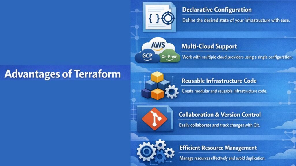 Collaboration and Version Control: Terraform configuration files can be stored in version control systems such as Git, which makes it easier for teams to collaborate and track changes to their infrastructure.